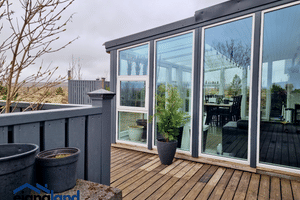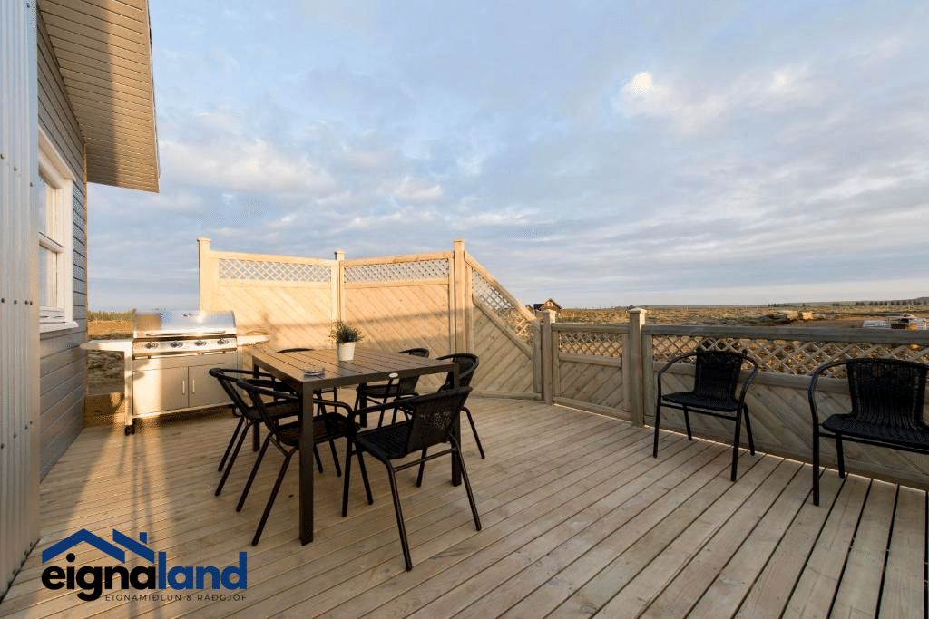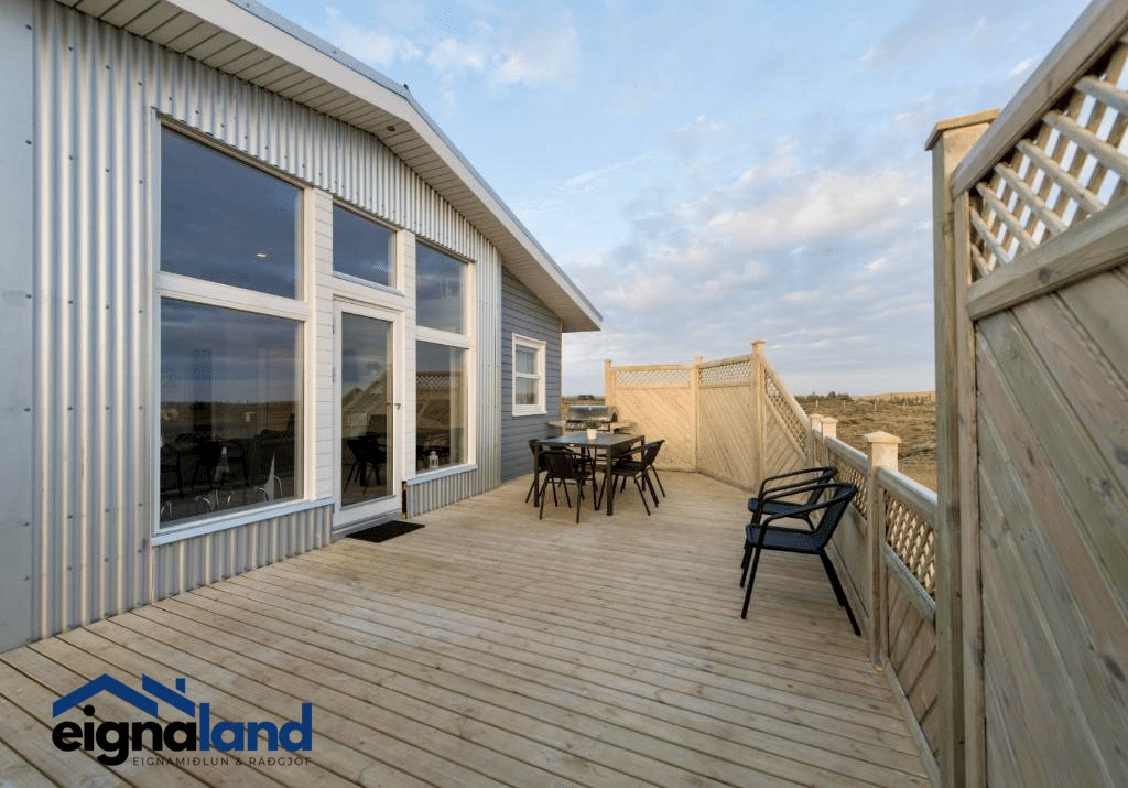 Stór verönd (38m2) fylgir húsunum ásamt skjólveggjum útigrilli og útihúsgögnum.