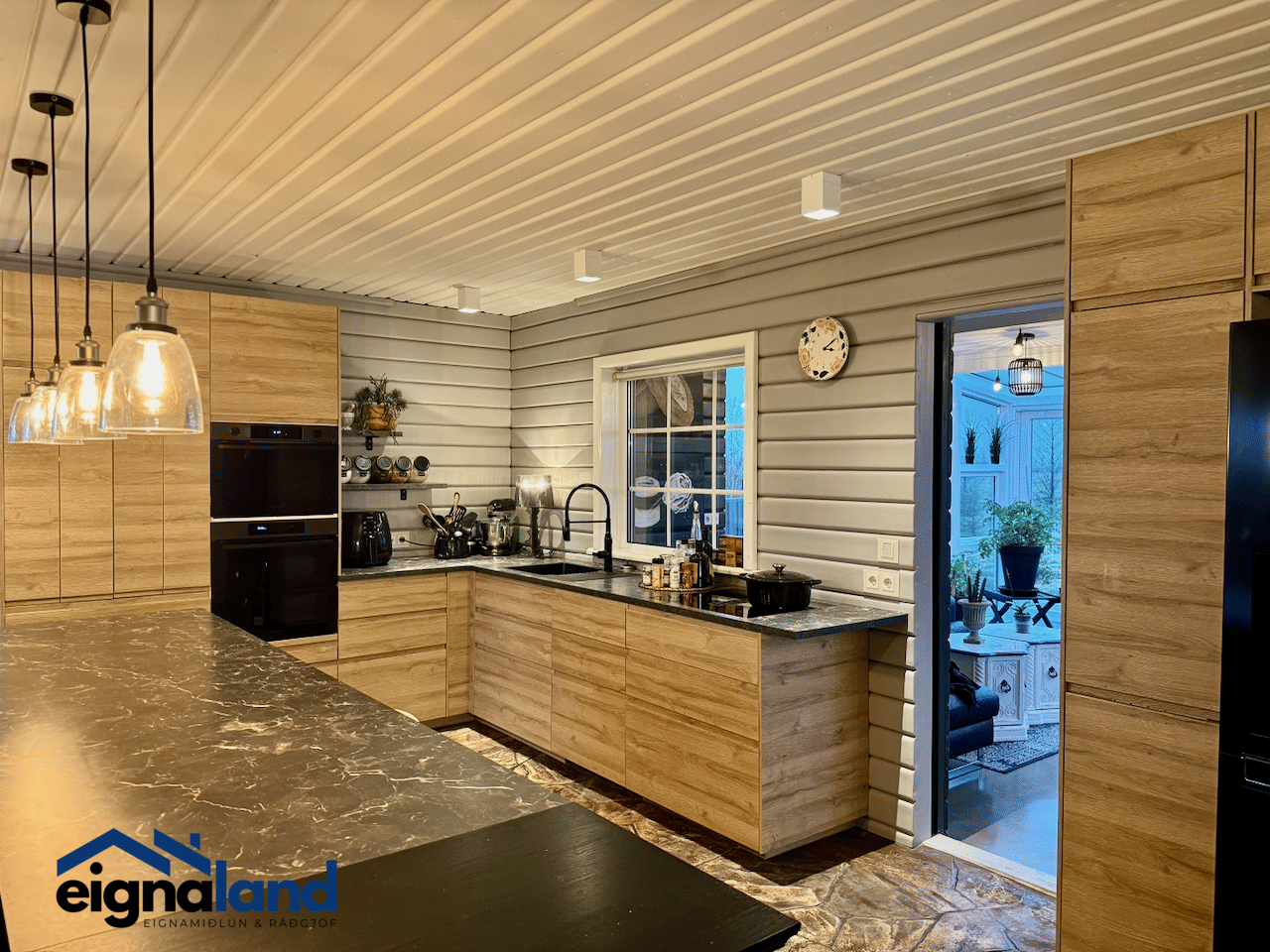 Neðri hæðin samanstendur af opnu rými með borðstofu, stofu og eldhúsi og útgengi í garðskála. Þá er þar einnig eitt svefnherbergi og baðherbergi með sturtu