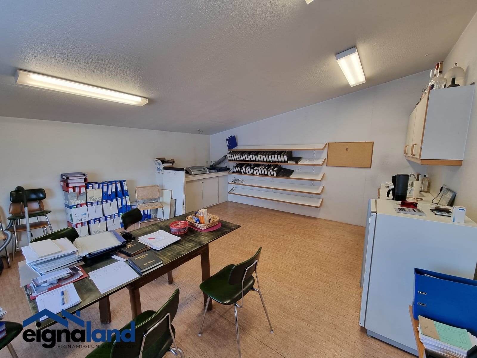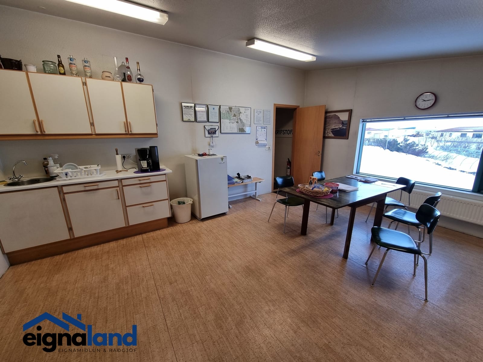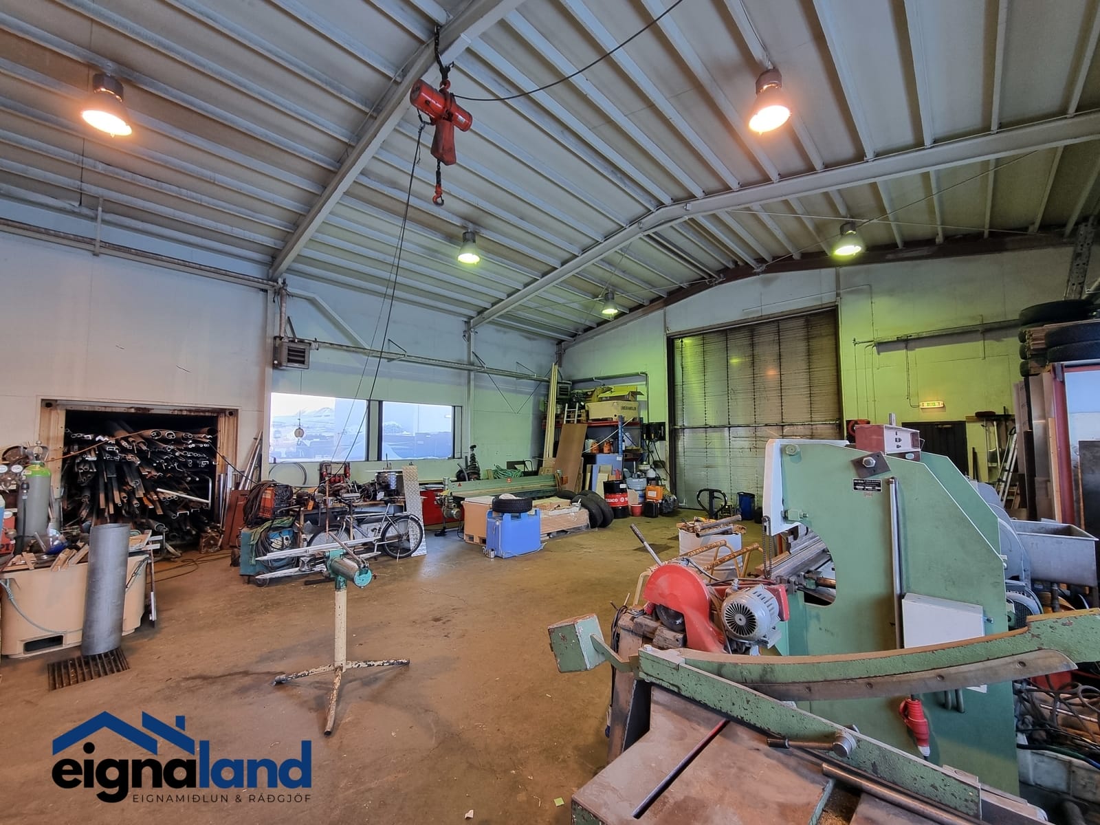 Að innan: Á neðri hæðinni er aðalsalur með mikilli lofthæð og stórri innkeyrsluhurð. Einnig er rými fyrir lager og hreinlætisaðstaða. Á efri hæðinni er skrifstofa og kaffistofa ásamt lager rými.