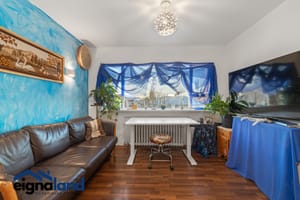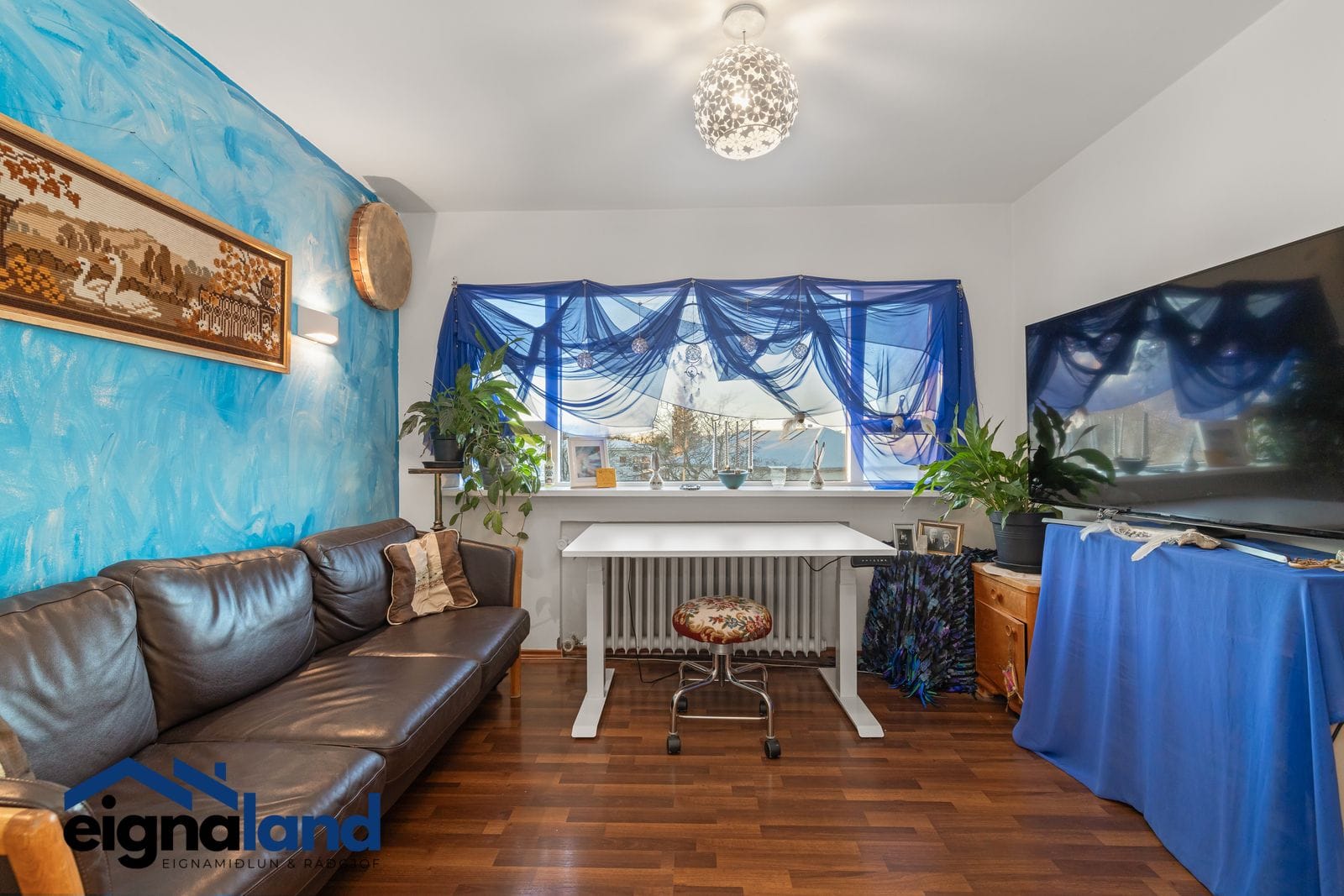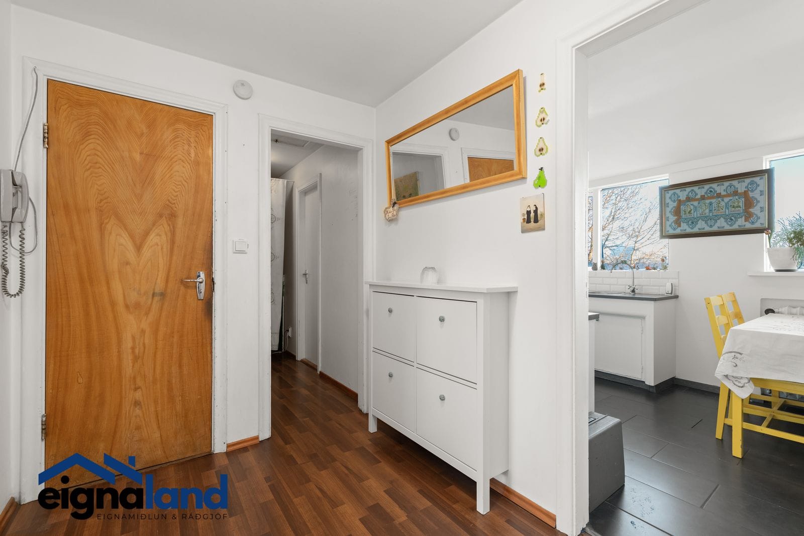 Nánari lýsing: Komið er inn um sameiginlegan ingang og gengið upp tröppur inn í íbúðina. Þaðan er komið inn í hol með fatahengi. Eldhús er með gamalli innréttingu og gluggum í norður, með góðu útsýni. Stofan er góð með stórum glugga, inn af stofu er herbergi/borðstofa. Tvö önnur svefnherbergi sem eru ágætlega rúmgóð, annað þeirra er með innbyggðum fataskáp. Baðherbergi er flísalagt í hólf og golf með baðkari, innréttingu og upphengdu salerni. Gluggi er á baðherbergi. Við hliðina á baðherbergi er mjór gagnur sem hægt er að nýta á margan hátt. - Plastparket er á gólfum nema baðherbergi og eldhúsi eru flísar. - Þvottahús er í sameign á neðstu hæð ásamt sameiginlegri geymslu.