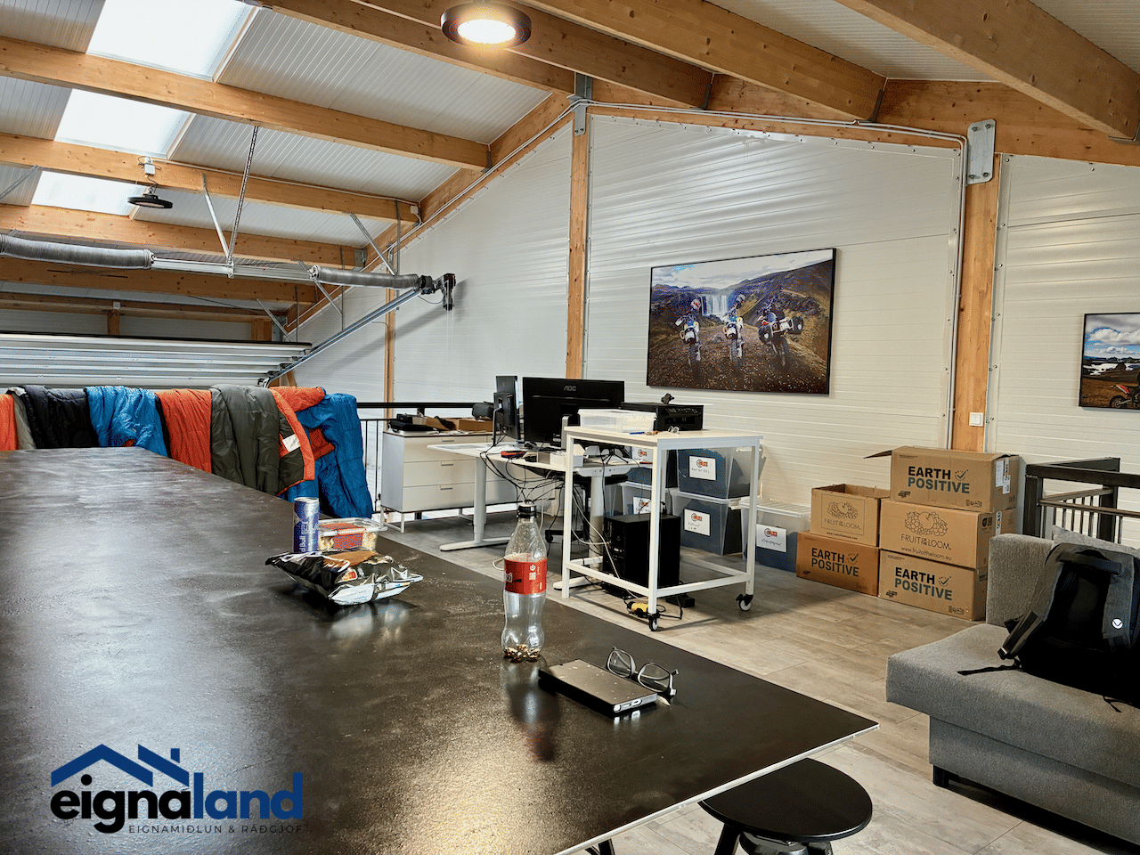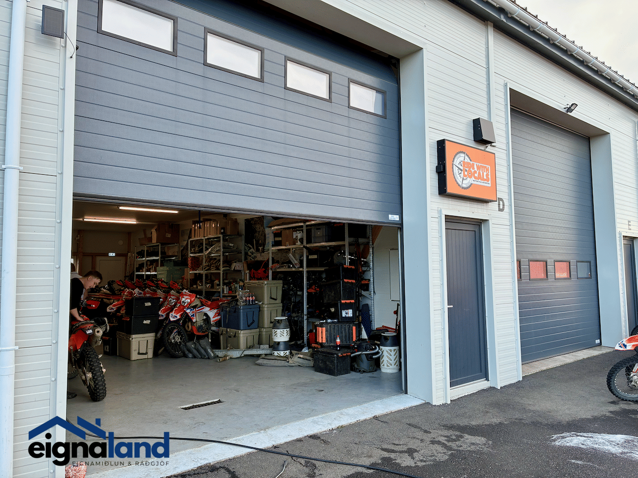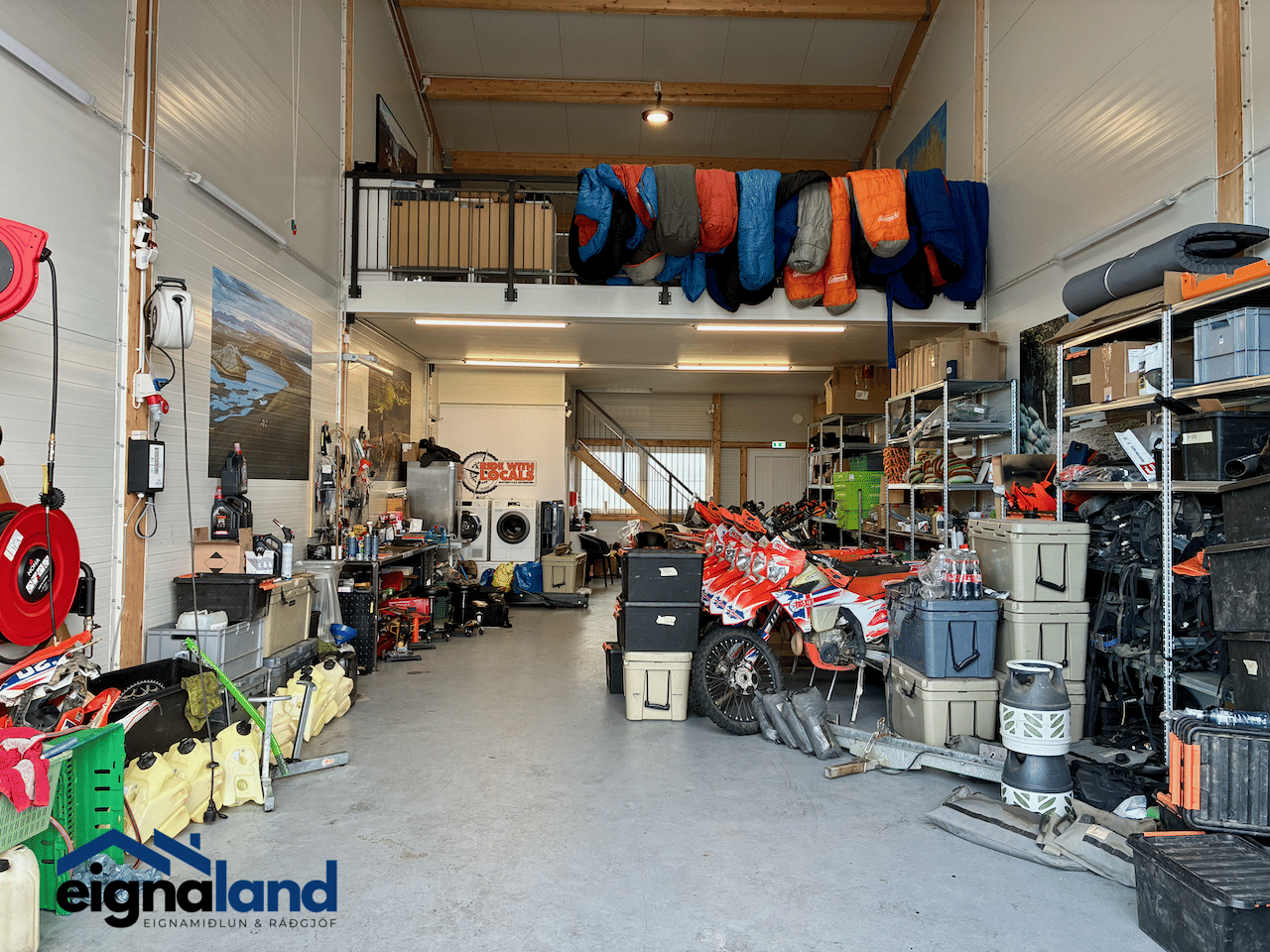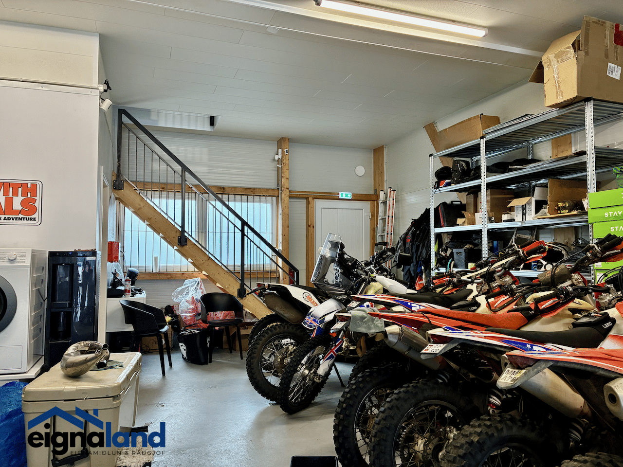 Húsið er í dag innréttað sem vinnusalur, lager/geymsla, salernis,- kaffiaðstaða - allt staðsett á grunnhæðinni. Á 2.hæðinni eða milliloftinu er kaffistofa, fundarrými og skrifstofa. Innkeyrsluhurð er í aðalrými frá Héðinshurðum, c.a. 4,3m á hæð og 4m á breidd, þar er einnig gönguhurð. Í húsinu er 3ja fasa rafmagn. Malbikað bílaplan er við húsið og séreignaflötur framan við bilið. Límtréshús, klætt með yleiningum, byggt 2023.